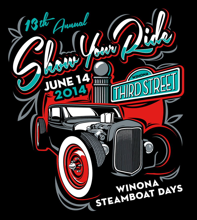 Car show t-shirt design for the Steamboat Days Car Show in Winona, Minnesota. This will be a 4 color print on black t-shirts. All vector art, created using Adobe Illustrator.